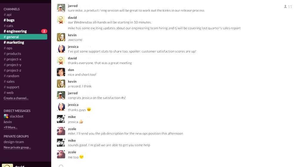 Public channels allow team members to communicate without the use of email or group SMS (texting). They are open to everyone in the chat provided they have first been invited to join the client. Private channels allow for private conversation between smaller sects of the overall group. These can be used to break up large teams into their own respective projects. Direct messages allow users to send private messages to a specific user rather than a group of people. Direct messages can include up to nine people (the originator plus eight people). Once started this direct message group can be converted to a private channel.
